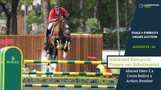 This embryo is bred from the direct dam line of the Grand Prix sport and breeding stallion Kashmir van Schuttershof, who made his mark at the Olympics with two offspring in the individual top-five. Indeed, through the Grand Prix stallions Conte Bellini and Action-Breaker, this maternal line goes back to Kashmir's dam. This Fines van Kameren also produced Kashmir's full sister, the international 1.60m-classified Sissi van Schuttershof who was ridden by Jur Vrieling. Linked to this Belgian performance pedigree is the stallion Akarad Hero Z, who has proven himself in the sport with Pieter Clemens at the international 1.60m level. Like his half-brothers, the 1.45m-classed Don't Touch Tiji Hero and top talent Drummer 2000 TN, Akarad Hero Z is firmly established as a sire.