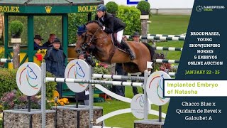 Under Olivier Robert, the Cornet Obolensky son Vangog du Mas Garnier performed outstandingly at the highest level for years. This French stallion competed on 1.65m-level and, among other successes, won the 2021 GCT Grand Prix in Rome. This embryo was bred from the same dam as Vangog du Mas Garnier. The Quidam de Revel daughter Natasha is herself a half-sister to several international showjumpers and licensed stallions, including the 1.50/1.60m-level Finbarr V (s.Cash) ridden by Robert Whitaker and David Jobertie’s stallion Triomphe de Muze (s.Chin Chin). Nayel Nassar’s international 1.55m-level performer Dorado de Riverland traces back to Natasha in the second generation. The genes of top sire Chacco-Blue have been added to this French performance family.