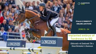 This embryo combines the very successful Grand Prix sport and breeding stallions Eldorado van de Zeshoek and Heartbreaker with one of the best jumping damlines in the world. Granddam Elektra des Premices is already competing on international 1.50m level at the age of nine under Margaux Rocuet. This Kannan mare is a (half-)sister of four international showjumpers, including the 1.50/1.55m level competing classified Enjoy d’Eole (s.Kannan) and Viking d’Eole (s.Toulon). In the fourth generation, this leading line leads back to the famous mare Fragance de Chalus. This top mare already produced a series of international offspring, including the valuable Grand Prix stallions Mylord Carthago (s.Carthago), Norton d’Eole (s.Cento) and Bamako de Muze (s.Darco).
