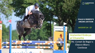 As a half-sister of the Grand Prix stallion Balou du Reventon (s.Cornet Obolensky), who is very successful under Brian Moggre, top progenitor Balou du Rouet (s.Baloubet du Rouet) and full sister of the Grand Prix stallion Chatinue, who has performed at 1.60m level with Darragh Kenny, has dam Chanette an exceptional pedigree. Her dam Georgia also proves her value with offspring at 1.45/1.50m level such as Balissimo (s.Baloubet du Rouet) and Cassilou (s.Caressini L) and is listed as the granddam of 1.50/1.60m horses like Zeusz (s.Cartogran), Conthacca (s.Conthargos), Chaginue (s.Chacco-Blue) and Conchacco (s.Conthargos). This embryo descends from the promising stallion Mr.Cornet de Regor, who was approved with 86.5 points.