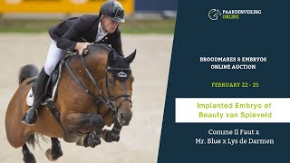 As a half-sister of the Grand Prix showjumpers Summer van Spieveld (s.Capital) of Mandy Porter, Falco van Spieveld (s.Toulon) of Nicole Walker and Quinta van Spieveld (s.Capital) with whom Celso Luis Camargo Ariani took part in the World Equestrian Games in 2002, this embryo’s dam Beauty van Spieveld represents a first class family. Granddam Melissa also produced the international 1.45m level showjumper Ensor van ‘t Spieveld and is listed as the granddam of the Grand Prix showjumper Vedette van Spieveld of Yannick Martin. This embryo is sired by the very valuable Grand Prix stallion Comme Il Faut, who develops into -just like the famous dam’s sire Mr.Blue already did- into an outstanding progenitor of Grand Prix showjumpers.