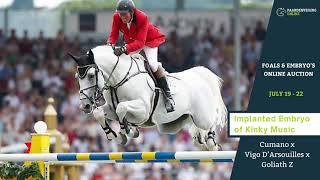 In the pedigree of this embryo, is the well-producing world champion Cumano coupled to an interesting full sister of the famous Grand Prix mare Funky Music ridden by Ann Carton-Grootjans. This successful sports mare already produced five international offspring, including the 1.60m level competing stallion El Torreo de Muze (s.Taran de la Pomme) and Bretling du Paradis Z (s.Bamako de Muze). Kinky Music is also a half-sister of the 1.55m showjumper Kapruul F (s.Diamant de Semilly). This excellent damline has produced a series of international showjumpers, including the 1.65m level competing H5 Just the Music (s.Tornedo FCS) of Carlos Hank Guerreiro and the 1.55m showjumper Cacacha van het Schaeck (s.Bamako de Muze) of Max Sebrechts.