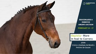The oldest offspring of Oquista is the international 1.40m level competing showjumper Chacristo (s.Chacco-Blue), and her offspring Kalusha (s.Cartano) is already performing at international 1.30m level. Dam Oquie Dame de Mai has already produced four international showjumpers, including the 1.45m level competing Uptons Tribon (s.C-Ingmar) ridden by Robin Bril. Dam Oquie Dame de Mai herself is a half-sister to the 1.45m horses Phlush (s.Kannan) and Special de Gamet (s.Stakkatol). Granddam Ivresse de Gamet is, in turn, a sibling to the Grand Prix stallion Triomphe de Muze (s.Chin Chin) and the also at the highest level performing Finbarr V (s.Cash). The oldest offspring of the well-producing sire Cristo have excelled at the highest level, including horses like Christos, Belanda and Cristo. This mare is in foal to the Grand Prix stallion Carrera VDL.