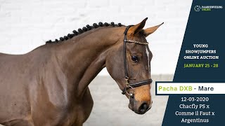 This talented Pacha DXB represents a solid French performance damline and is related to a large number of international showjumpers. Her dam Cartier von der Held DXB combines the top breeding stallions Comme Il Faut and Argentinus, and is herself a half-sister of several 1.35m level showjumpers. Granddam Argentina du Toultia DXB is a half-sister of more than ten international performers, including the 1.50/1.60m level jumping horse Cannonball du Toultia Z (s.Copin van de Broy) of Talal Al Zahem and the 1.40/1.45m level competing Daytona du Toultia and Again du Toultia. Listed as the sire is Chacfly PS, who is performing at international 1.45m level after an exceptional performance in the German stallion test. His oldest offspring stand out in the Youngster Tour.