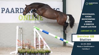 Survivor EB is a descendant of the KWPN-approved stallion Mans, who earned an impressive 88 points as a three-year-old and is now competing under Rodrigo Almeida. His dam Butter Flower competed internationally at the 1.35m level with Britt ter Harmsel and is one of five international performers produced by the remarkable granddam May-Flower. May-Flower is also the dam of the 1.60m-classified Vrieda Imperio Egipcio (by Hold Up Premier), ridden by Ibrahim Bisharat, as well as the 1.45/1.50m horses A-Frieda O (by Goodtimes), Dancer (by Harley VDL), and Rockella-S (by Little Rock). Additionally, May-Flower forms the foundation of 1.50/1.60m-level horses such as Highlight W (by Berlin), Kalahari Rock (by Harley VDL), Interessant (by Zavall VDL), and Kingston (by Etoulon VDL).