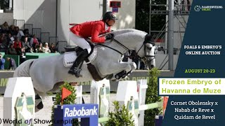 Dit embryo brengt dus het beste van twee werelden samen: de Olympische klasse en verervingskracht van Cornet Obolensky gekoppeld aan de wereldberoemde Qerly Chin-dynastie via Havanna de Muze. Een garantie voor bloed, vermogen en prestatiedrang. Klaar om de toekomst van de sport en fokkerij te versterken.