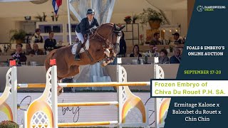 Moeder Chiva du Rouet P.H. SA is een jonge halfzus van niet minder dan negen internationale springpaarden, waaronder de 1.60m-hengst Akarad Hero Z van Pieter Clemens, de 1.50m-geklasseerde King of China Hero Z en meerdere 1.45m-paarden waaronder de sterk verervende hengst Don’t Touch Tiji Hero. Ook de in de hengstencompetitie excellerende Drummer 2000 TN komt rechtstreeks uit China Touch Hero, de grootmoeder van dit embryo. Zelf is zij een halfzus van onder andere de 1.50/1.60m-paarden Tinka’s Hero Z, Elasko Hero, Gracieux du Pachis en Verdini d’Houtveld Z. Aan deze uitstekende stam zijn de genen van de Olympische hengst Ermitage Kalone toegevoegd. Onder Thomas Gilles behaalde deze goed verervende hengst al prominente GP overwinningen.