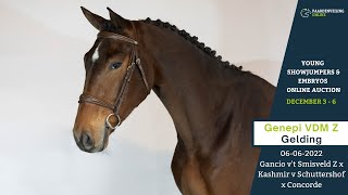 Deze beloftevolle driejarige ruin is gefokt uit de merrie Tequila du Pachis, die de gewaardeerde internationale sport- en fokhengsten Kashmir van Schuttershof en Concorde combineert. Aangepaard met Dominator 2000 Z leverde ze al het zevenjarige springpaard D’Artagnan Z, die op het internationale 1.35m geklasseerd is. Grootmoeder Qualine du Pachis is een halfzus van het internationale 1.45m-springpaard Opus du Pachis (v.Heartbreaker) van Lieven Devos en het 1.40m-springpaard Naiade du Pachis (v.Nabab de Rêve) van Marcel Ewen. Genepi VDM Z komt uit de tweede jaargang van de internationaal 1.45m-geklasseerde hengst Gancio van ’t Smisveld Z, die als kleinzoon van topmerrie Gancia de Muze een grote toekomst voor zich heeft.