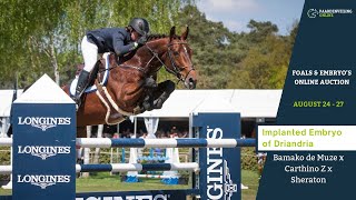 De onder Piergiorgio Bucci op internationaal 1.70m-niveau geklasseerde Driandria heeft een intensieve topcarrière achter de rug. Ze won de 1.55m-Grand Prix van Saint Tropez, plaatste zich onder meer in de Grand Prixs van CSI3* Arnhem, CSI4* San Giovanni en de Wereldbeker van CSI5* Lyon. Ook finishte ze in de 1.70m-Grand Prix van Calgary en ze won de Spruce Meadows 5* Six Bars! Driandria heeft een volle broer in het internationale 1.45m-springpaard Ciandro van Marie-Louise Thomas en ze is een halfzus van het 1.40m-paard Giandra (v.Andiamo). Voor het vaderschap tekent de waardevolle Grand Prix sport- en fokhengst Bamako de Muze, die naam maakt met nakomelingen als Don Juan vd Donkhoeve, Kasanova de la Pomme and Bellissimo Z. Dit exclusieve embryo wordt één van haar allereerste nakomelingen.