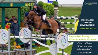 Topverervers Chacco-Blue en Kashmir van Schuttershof gecombineerd met de ijzersterke stam van Qerly Chin, daarmee laat dit embryo genetisch gezien niks te wensen over. Moeder Chabada de la Pomme is een halfzus van reeds 15 internationale springpaarden, waaronder de op 1.55/1.60m-niveau presterende Huxx de Muze (v.Nabab de Rêve), Heroine de Muze (v.Tinka’s Boy) en Iphigeneia de Muze (v.Erco van ‘t Roosakker). In de derde generatie treffen we de voortreffelijk verervende Grand Prix-merrie Narcotique de Muze II, die onder Eric Lamaze successen boekte. Zij bracht onder meer de internationale 1.60m-paarden Farfelu de la Pomme, Sea Coast Ferly, Boyante de Muze, Giovani de la Pomme alsmede de 1.55m-geklasseerde hengst Querlybet Hero.