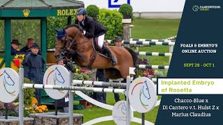 ’s Werelds beste vererver Chacco-Blue is in de pedigree van dit embryo samengebracht met deze veelbelovende Rosetta die uit een sterke moederlijn komt. In de derde generatie gaat zij rechtstreeks terug op de internationale sport- en fokmerrie Narcotique de Muze IV, die met Johan Philippaerts tot op 1.50m-niveau heeft gepresteerd en een ongekend nalatenschap heeft opgebouwd. Zo is ze moeder van meer dan tien internationaal presterende nakomelingen waaronder de goed verervende Grand Prix-hengst Jenson van ’t Meulenhof (v.Vagabond de la Pomme) en de 1.50m-geklasseerde vererver Denzel van ’t Meulenhof (v.Marius Claudius).
