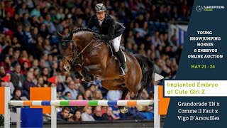 Onder Willem Greve behaalde grootmoeder Pretty Woman van ’t Paradijs onlangs groots succes door het Nederlandse kampioenschap op haar naam te zetten. Het einde van het kunnen van deze opvallende Vigo d’Arsouilles-dochter is nog lang niet in zicht en dit interessante embryo komt uit Pretty Woman’s dochter Cute Girl Z. Heel interessant is dat hier drie merries opeengestapeld zijn die allen op het hoogste niveau gepresteerd hebben. Grootmoeder Monalisa van ’t Paradijs deed dat onder Gudrun Patteet, overgrootmoeder Jeunesse van ’t Paradijs presteerde met Lorenzo De Luca. Gecombineerd met deze prestatierijke moederlijn is meervoudig Grand Prix-winnaar Grandorado TN, die zich ontwikkeld tot een opvallende vererver.
