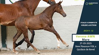 Onder Hessel Hoekstra bouwt vader New Pleasure VDL een geweldige erelijst op. Deze tweevoudige hengstencompetitiewinnaar heeft ook internationaal al overwinningen behaald en lijkt, ook dankzij zijn geweldige afkomst, voor de fokkerij een grote aanwinst. Dit merrieveulen Verona AWN voert van moederszijde de waardevolle genen van de Olympische topvererver Quidam de Revel en moeder Aquidam bracht eerder al de internationale 2*-eventer L’Quidam VK. Zelf is Aquidam een halfzus van de internationaal 1.40m-geklasseerde King Louis (v.Locarno). Deze moederlijn bracht onder meer ook de 1.55m-geklasseerde Badorette (v.Numero Uno), die al meer dan 35 internationale zeges boekte waaronder zeven Grand Prixs.