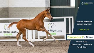 Under several riders, including Beezie Madden, sire Darry Lou has proven to be one of the very best showjumpers in the world. The multiple Grand Prix winner represents a first-class performance family and is therefore also very valuable for breeding. This year his first foals on European soil were born, including this Darrynola Z. She is the first foal of Darry Lou to be offered through auction, a godsend! The oldest offspring of dam Enola already performs on 1.30m level and she herself is a half-sister of various 1.35/1.40m level horses, including the internationally 1.40m level competing Finola (s.Cardento). International 1.45/1.50m level jumping horses such as Unola (s.Ferro), Betty Boop (s.Carolus II) and Porland (s.Corland) also originate from this family. More performance genes are contributed by the Grand Prix sport and breeding stallions Corland and Quick Star.