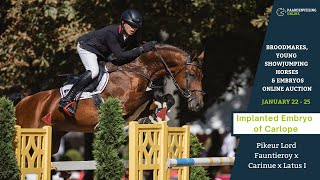 Dam Carlope comes from the prominent breeding of Paul Schockemöhle and is closely related to a large number of international sporthorses. For example, she is a half-sister of the internationally 1.60m-classified Kannan Lover (s.Kannan) and the 1.45m-classified Kanlata (s.Kannan) and Carthago Lover (s.Carthago). Granddam Penny Lover can be found in the second generation behind a series of successful horses including the 1.60m-classified horses Centolove (s.Cento), Bacentus (s.Balou du Rouet), Gabbiano 11 (s. Grandino) and the Oldenburg licensed Grand Prix stallion Diablo Blanco (s.Chacco-Blue). In addition, the embryo is a 3/4 sister to Chacco Lover (s.Chacco-Blue). This originally Westphalian line has been brought together here with the convincing Pikeur Lord Fauntleroy (s.Lord Pezi).