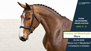 This interesting Texana van de Moerhoek is a granddaughter of the international 1.50m level mare Dior van het Costersveld (s.Orlando), with whom Kelly Ettori has also been competing at 1.60m level. Dior van het Costersveld is in turn a half-sister of the international 1.45m level performer Elini van het Costersveld (s.Quite Easy I). The damline continues with a half-sister of the German approved stallion Argos van het Costersveld (s.Orlando), who jumped at 1.40m level under Jörg Naeve. This is the direct damline of 1.50/1.60m horses such as Eclips (s.Clinton), Boomerang van het Kluizebos (s.Clinton), Grand Cru van de Vijf Eiken (s.Contact vd Heffinck) and Upsilon vd Heffinck (s.Clinton). Sire Nixon van 't Meulenhof stands out at the highest level with Jos Verlooy.