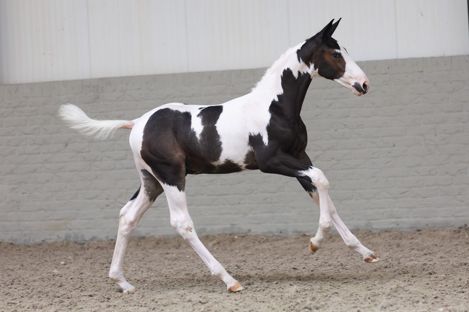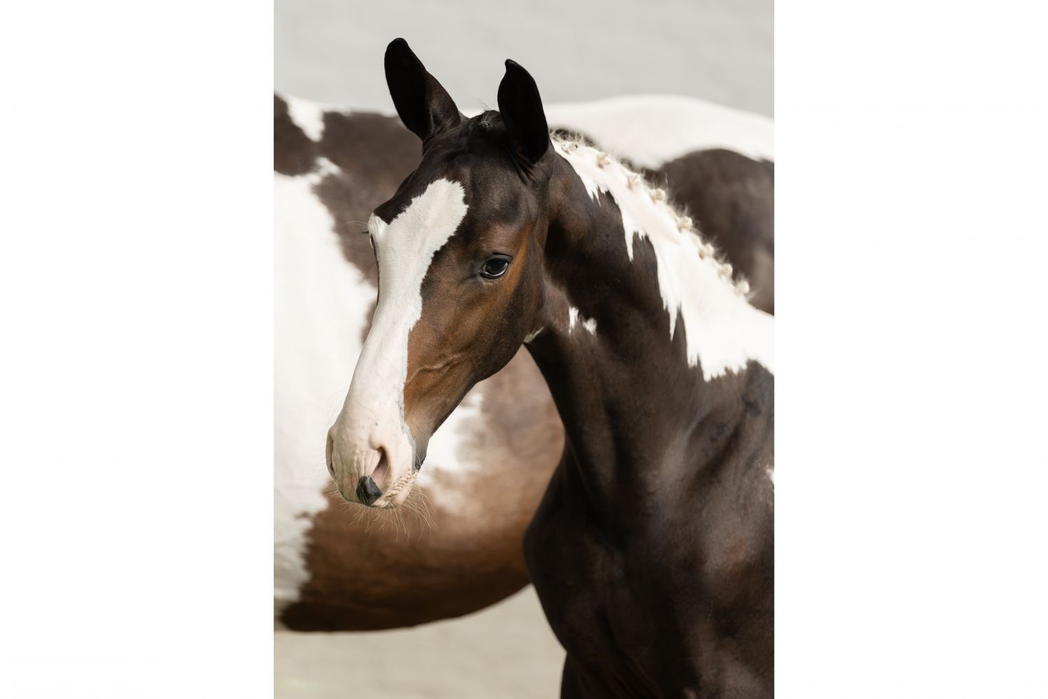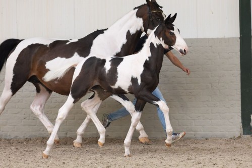 This eye-catcher combines the jumping talent of his sire with the distinctive color of his dam, Double Active. Urus is a son of the ten-year-old Holsteiner stallion Comthago VDL, with whom Hessel Hoekstra made a fantastic 1.60m debut this year. Their highlights already include a victory in the 1.55m Grand Prix of Ommen and a silver medal at the Dutch Championships. Expectations are high for both sport and breeding. Granddam Unicorn is a half-sister to the international showjumper Merlijn (s.Samber) and represents an allround damline, which also includes international eventers. The flagship of this damline is the renowned pinto stallion Samber. In the fifth generation, this line traces back to his full sister.